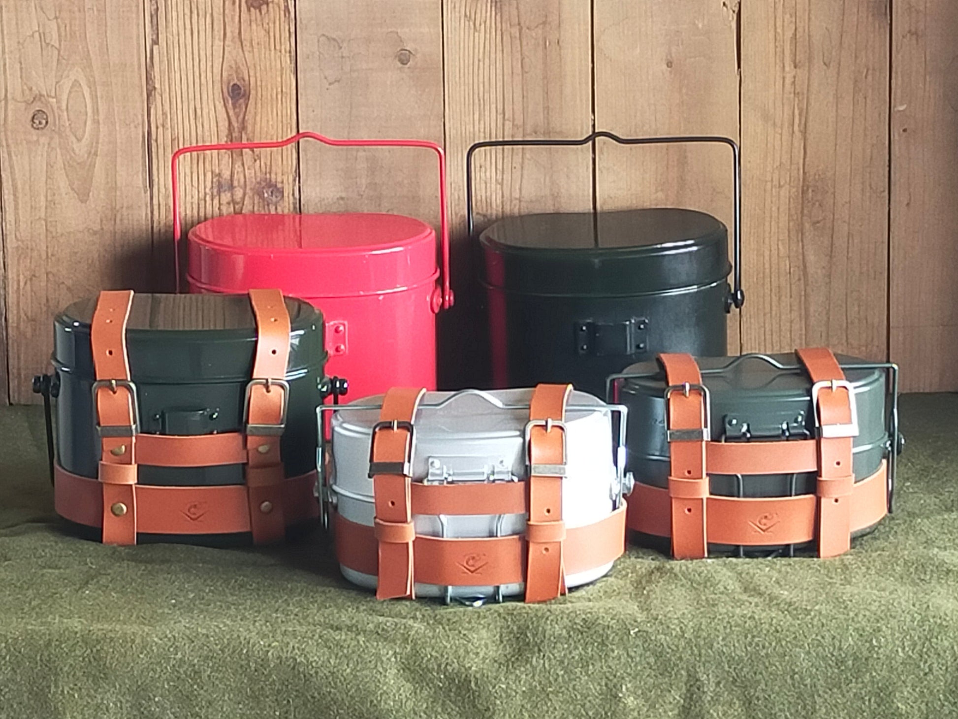 〇飯盒をベルトで固定することで、持ち運びの際のがたつきや、蓋が外れるのを防ぎます。